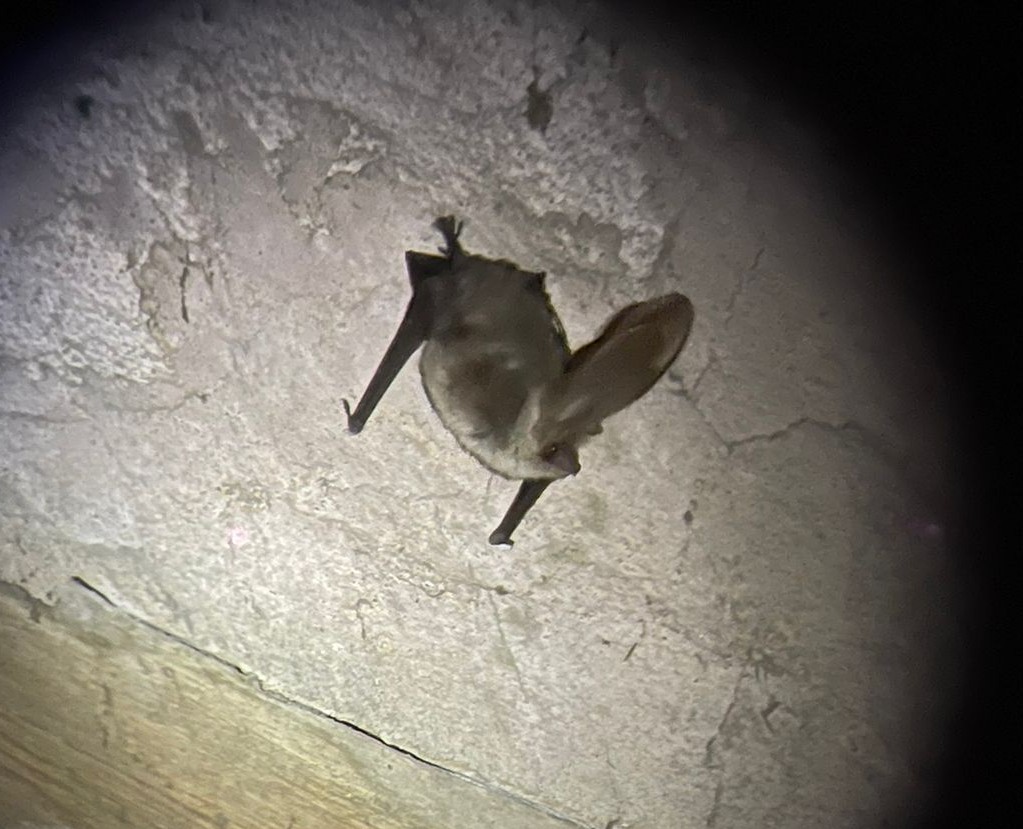 Für manche Projekte, in denen Gebäude im Winter abgerissen oder saniert werden müssen, werden derzeit noch Untersuchungen für Fledermäuse durchgeführt - hier zum Beispiel wurde ein Graues Langohr hängend in einer Stallung beobachtet und ausnahmsweise in Weiß angestrahlt, um es sicher zu identifizieren.
